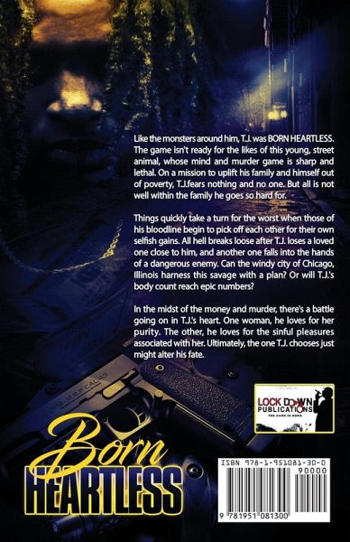 Like the monsters around him, T.J. was BORN HEARTLESS. The game isn't ready for the likes of this young, street animal, whose mind and murder game is sharp and lethal. On a mission to uplift his family and himself out of poverty, T.J.fears nothing and no one. But all is not well within the family he goes so hard for. Things quickly take a turn for the worst when those of his bloodline begin to pick off each other for their own selfish gains. All hell breaks loose after T.J. loses a loved one close to him, and another one falls into the hands of a dangerous enemy. Can the windy city of Chicago, Illinois harness this savage with a plan? Or will T.J.'s body count reach epic numbers?In the midst of the money and murder, there's a battle going on in T.J.'s heart. One woman, he loves for her purity. The other, he loves for the sinful pleasures associated with her. Ultimately, the one T.J. chooses just might alter his fate.