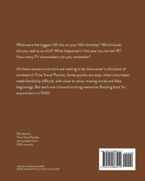 This book of wordsearch puzzles is packed with people, things and events from your year of birth onwards. If you were born in 1940 then this is the wordsearch book for you! 1940 was the year of The Blitz, the Thames froze over and Churchill became PM. You won't remember that, but what about trams and gabardine raincoats? How about the books you read as a child? Do you recall which household goods were on ration? And then you grew up... but what happened in the year you turned 21? Which Olympics can you remember? What were the biggest UK hits on your 40th birthday? You'll find all these and many more in this nostalgic look at UK life since you were born. This is a large-format word search book with easy-to-read type. Some of these Time Travel Puzzles are easy; others have been made fiendishly difficult with clues to solve, missing words and false beginnings. But each one is bound to bring memories flooding back for anyone born in 1940!