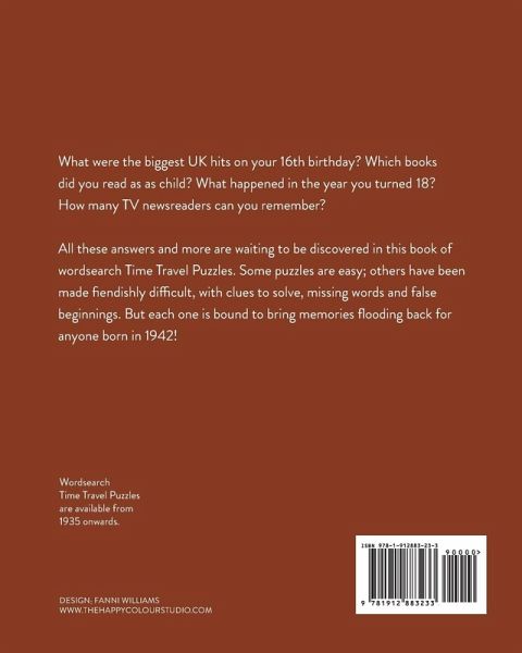 This book of wordsearch puzzles is packed with people, things and events from your year of birth onwards. If you were born in 1942 then this is the wordsearch book for you! 1942 was the year of the Beveridge report, the seizing of an Enigma machine and the first Desert Island Discs. You won't remember that - but what about nursery squares, gym tunics and distemper paint? How about the books you read as a child or the goods on ration? And then you grew up... but what happened in the year you turned 21? Which Olympics can you remember? What were the biggest UK hits on your 40th birthday? You'll find all these and many more in this nostalgic look at UK life since you were born. This is a large-format word search book with easy-to-read type. Some of these Time Travel Puzzles are easy; others have been made fiendishly difficult with clues to solve, missing words and false beginnings. But each one is bound to bring memories flooding back for anyone born in 1942!