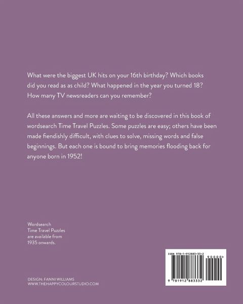 This book of wordsearch puzzles is packed with people, things and events from your year of birth onwards. If you were born in 1952 - with your 68th birthday in 2020 - then this is the wordsearch book for you! 1952 was the year that George VI died and the last tram ran in London. You won't remember that - but what about the books you read as a child, or the foods still on ration? And then you grew up... but what happened in the year you turned 21? Which Olympics can you remember? What were the biggest UK hits on your 40th birthday? You'll find all these and many more in this nostalgic look at UK life over the last 68 years. This is a large-format word search book with easy-to-read type. Some of these Time Travel Puzzles are easy; others have been made fiendishly difficult with clues to solve, missing words and false beginnings. But each one is bound to bring memories flooding back for anyone born in 1952!