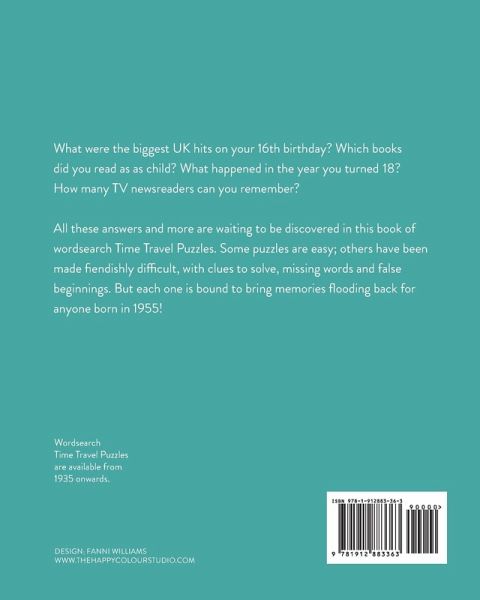 This book of wordsearch puzzles is packed with people, things and events from your year of birth onwards. If you were born in 1955 - with your 65th birthday in 2020 - then this is the wordsearch book for you! 1955 was the year that Churchill resigned and fishfingers hit the shops. You won't remember that, but how about the books you read as a child, or pre-decimal coins? And then you grew up... but what happened in the year you turned 21? Which Olympics can you remember? What were the biggest UK hits on your 40th birthday? You'll find all these and many more in this nostalgic look at UK life over the last 65 years. This is a large-format word search book with easy-to-read type. Some of these Time Travel Puzzles are easy; others have been made fiendishly difficult with clues to solve, missing words and false beginnings. But each one is bound to bring memories flooding back for anyone born in 1955!