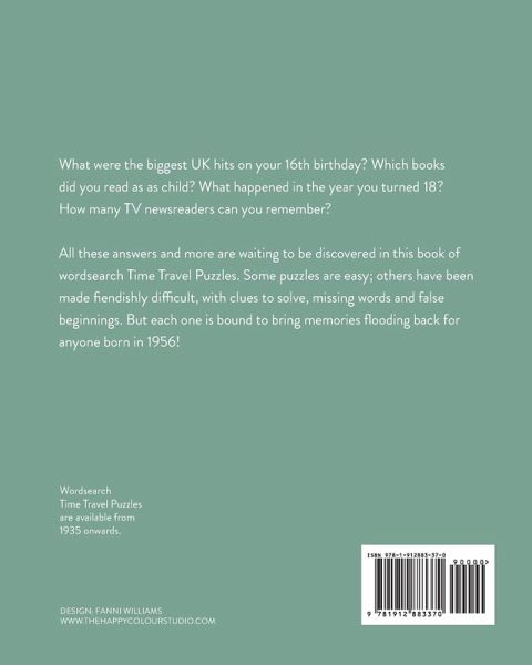 This book of wordsearch puzzles is packed with people, things and events from your year of birth onwards. If you were born in 1956 - with your 64th birthday in 2020 - then this is the wordsearch book for you! 1956 was the year of the first transatlantic phone call and the end of third class on the railways. You won't remember that - but what about the books you read as a child, or the launch of Radio 1 when you were 11? And then you grew up... but what happened in the year you turned 21? Which Olympics can you remember? What were the biggest UK hits on your 40th birthday? You'll find all these and many more in this nostalgic look at UK life over the last 64 years. This is a large-format word search book with easy-to-read type. Some of these Time Travel Puzzles are easy; others have been made fiendishly difficult with clues to solve, missing words and false beginnings. But each one is bound to bring memories flooding back for anyone born in 1956!