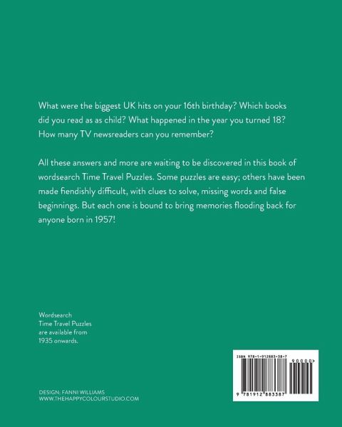 This book of wordsearch puzzles is packed with people, things and events from your year of birth onwards. If you were born in 1957 - with your 63rd birthday in 2020 - then this is the wordsearch book for you! 1957 was the year that Macmillan became PM and Panorama's spaghetti tree hoax. You won't remember that, but what about the DJs who launched Radio 1 when you were 10, or the books you read as a child? And then you grew up... but what happened in the year you turned 21? Which Olympics can you remember? What were the biggest UK hits on your 40th birthday? You'll find all these and many more in this nostalgic look at UK life over the last 63 years. This is a large-format word search book with easy-to-read type. Some of these Time Travel Puzzles are easy; others have been made fiendishly difficult with clues to solve, missing words and false beginnings. But each one is bound to bring memories flooding back for anyone born in 1957!