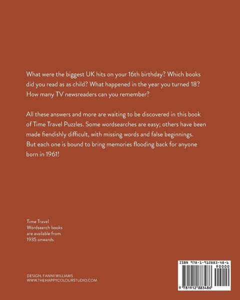 A bumper book of wordsearch puzzles packed with people, things and events from 1961 to the present day. If you were born in 1961, then this is the wordsearch book you've been looking for. That was the year that brought us the first Mothercare store, the Jaguar E-Type, Songs of Praise... and you! You won't remember much about that, but what about the books you read as a child, or the DJs who launched Radio 1 in 1967? And then you grew up... but what happened in the year you turned 21? Which Olympics can you remember? What were the biggest UK hits on your 40th birthday? You'll find all these and many more in this nostalgic look at the UK over your lifetime. This is a large-format word search book with easy-to-read type - but this is no ordinary puzzle book. Some of these Time Travel Puzzles® are easy; others have been made fiendishly difficult with clues to solve, missing words and false beginnings. But each one is bound to bring memories flooding back for anyone born in 1961!
