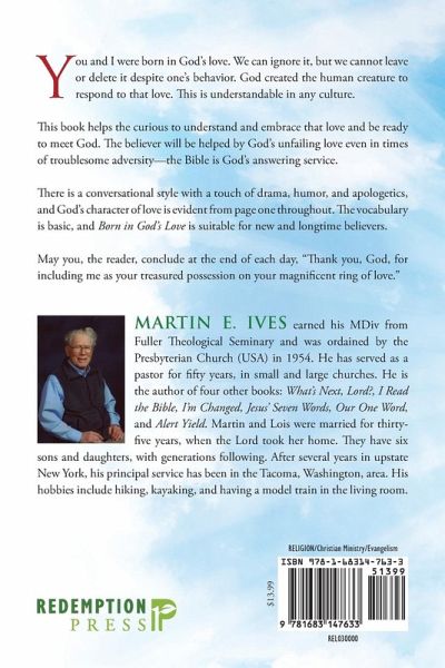 You and I were born in God’s love. We can ignore it, but we cannot leave or delete it despite one’s behavior. God created the human creature to respond to that love. This is understandable in any culture. This book helps the curious to understand and embrace that love and be ready to meet God. The believer will be helped by God’s unfailing love even in times of troublesome adversity—the Bible is God’s answering service. There is a conversational style with a touch of drama, humor, and apologetics, and God’s character of love is evident from page one throughout. The vocabulary is basic, and Born in God’s Love is suitable for new and longtime believers. May you, the reader, conclude at the end of each day, "Thank you, God, for including me as your treasured possession on your magnificent ring of love."