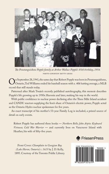 On September 28, 1941, the same day that Robert Popple was born in Penetanguishene, Ontario, Ted Williams ended his baseball season with a .406 batting average, a MLB record that still stands today. Patterned after Mark Twain's recently published autobiography, this memoir describes Popple's life growing up in 1950s Huronia and later, making his way in the world. With public confidence in nuclear power declining after the Three Mile Island accident and CANDU reactors supplying the lion's share of Ontario's electric power, Popple acted as the Ontario Hydro nuclear spokesman for five years. An exact transcript of his mother's 53-year Family Log is included, a prized source of detail on early events.
