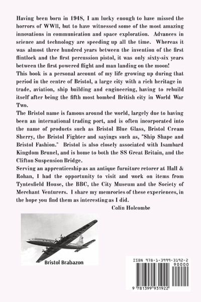 A personal account of growing up in the centre of a large city with a rich heritage in aviation, ship building, trade and engineering having to rebuild itself after being the fifth most heavily bombed British city in World War Two. After the war, everyone wanted and expected society to be better than before, and many people saw the destruction as an opportunity, to sweep away the old and re-build in the new "Modern Style." Unfortunately the new style with its reenforced concrete and large glass panels took little account of aesthetics, only practicality. There had been no research into how communities would be effected by these new surroundings, and so many mistakes were made. I was aware, even when a young child, of Bristol's heritage and often visited the Bristol City Docks or the Clifton Suspension Bridge, and when I started work as an apprentice antique restorer, I was lucky enough to carry out some work for Lord Wraxhall at Tyntesfiel House, before it was purchase by The National Trust, The Society of Merchant Venturers, Engineers House, the Red Lodge, the BBC and the City Museum and Art Gallery. My intention is to delve a little into their history as and when they crop up in the story of my early life in Bristol, and hope that you find both as interesting as I do. Colin Holcombe
