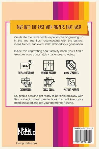 Relive the magic of the 70s and 80s one puzzle at a time! Relive the vibrant memories of the 1970s and 1980s with the Born in the 70s Activity Book for Adults. This carefully curated book is designed to transport you back in time, filling you with delightful puzzles that celebrate the remarkable experiences of growing up during that transformative period. With this captivating activity book, you'll have the opportunity to unlock the hidden treasures of the past and rediscover the cultural icons, trends, and events that shaped an entire generation. Why You'll Love the Born in the 70s Activity Book for Adults:Reconnect with the past and relive the magic of your formative years Engaging puzzles to test your knowledge, memory, and problem-solving skills Mental stimulation and relaxation in a therapeutic escape from the stresses of everyday life What's Inside?Trivia questions, Sudoku puzzles, word searches, crosswords, criss-cross word fills, number picture puzzles, and more Two separate sections celebrate memories across your entire youth from "Childhood in the 1970s" to "Adolescence in the 1980s" Includes full Answer Key, a section on how to do the puzzles, and a special bonus Don't miss this opportunity to experience the joy and excitement of an era that shaped your world. Grab your copy today and get ready to exercise your mind while basking in the warm embrace of cherished memories.