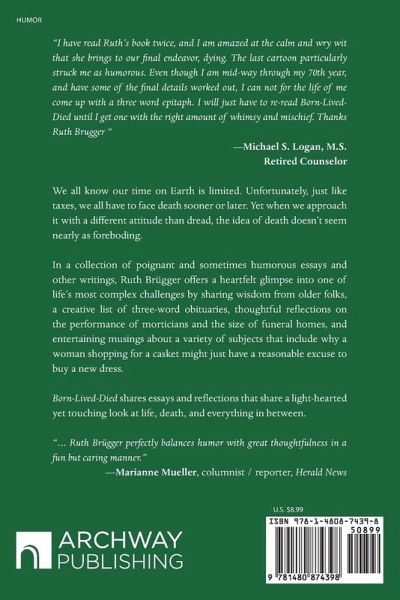 "I have read Ruth's book twice, and I am amazed at the calm and wry wit that she brings to our final endeavor, dying. The last cartoon particularly struck me as humorous. Even though I am mid-way through my 70th year, and have some of the final details worked out, I can not for the life of me come up with a three word epitaph. I will just have to re-read Born-Lived-Died until I get one with the right amount of whimsy and mischief. Thanks Ruth Brugger " --Michael S. Logan, M.S. Retired Counselor We all know our time on Earth is limited. Unfortunately, just like taxes, we all have to face death sooner or later. Yet when we approach it with a different attitude than dread, the idea of death doesn't seem nearly as foreboding. In a collection of poignant and sometimes humorous essays and other writings, Ruth Brugger offers a heartfelt glimpse into one of life's most complex challenges by sharing wisdom from older folks, a creative list of three-word obituaries, thoughtful reflections on the performance of morticians and the size of funeral homes, and entertaining musings about a variety of subjects that include why a woman shopping for a casket might just have a reasonable excuse to buy a new dress. Born-Lived-Died shares essays and reflections that share a light-hearted yet touching look at life, death, and everything in between. "... Ruth Brugger perfectly balances humor with great thoughtfulness in a fun but caring manner." --Marianne Mueller, columnist / reporter, Herald News