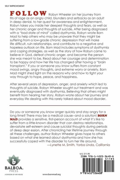 Follow Robyn Wheeler on her journey from fits of rage as an angry child, blunders and setbacks as an adult in deep denial, to her quest for awareness and enlightenment. Robyn takes you inside her deepest thoughts and fears, as well as her chronic anger and thoughts of suicide. After being diagnosed with a "bad state of mind" called dysthymia, Robyn wrote Born Mad to help others who may be unaware that they might be suffering from a low-grade chronic depression that will make life difficult, ruin relationships, and contribute to a negative and hopeless outlook on life. Born Mad includes symptoms of dysthymia and coping strategies, as well as the story of how Robyn came to believe in God, defeat chronic anger, and become the person she was meant to be. Read about her courage and determination to be happy and how her life has changed after having a "brain transplant." If you or someone you know suffers from constant mood swings, angry thoughts, and extreme worry or anxiety, Born Mad might shed light on the reasons why and how to fight your way through to hope, peace, and happiness.