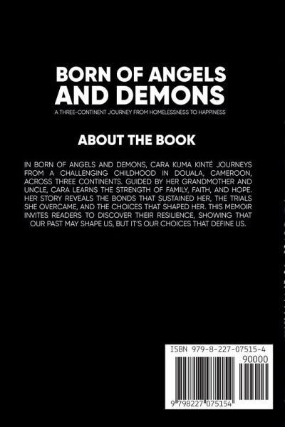 In Born of Angels and Demons, Cara Kuma Kinté journeys from a challenging childhood in Douala, Cameroon, across three continents. Guided by her grandmother and uncle, Cara learns the strength of family, faith, and hope. Her story reveals the bonds that sustained her, the trials she overcame, and the choices that shaped her. This memoir invites readers to discover their resilience, showing that our past may shape us, but it's our choices that define us.
