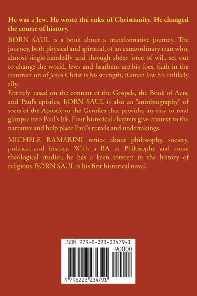 He was a Jew. He wrote the rules of Christianity. He changed the course of history. BORN SAUL is a book about a transformative journey. The journey, both physical and spiritual, of an extraordinary man who, almost single-handedly and through sheer force of will, set out to change the world. Jews and heathens are his foes, faith in the resurrection of Jesus Christ is his strength, Roman law his unlikely ally. Entirely based on the content of the Gospels, the Book of Acts, and Paul's epistles, BORN SAUL is also an "autobiography" of sorts of the Apostle to the Gentiles that provides an easy-to-read glimpse into Paul's life. Four historical chapters give context to the narrative and help place Paul's travels and undertakings. MICHELE RAMARINI writes about philosophy, society, politics, and history. With a BA in Philosophy and some theological studies, he has a keen interest in the history of religions. BORN SAUL is his first historical novel.