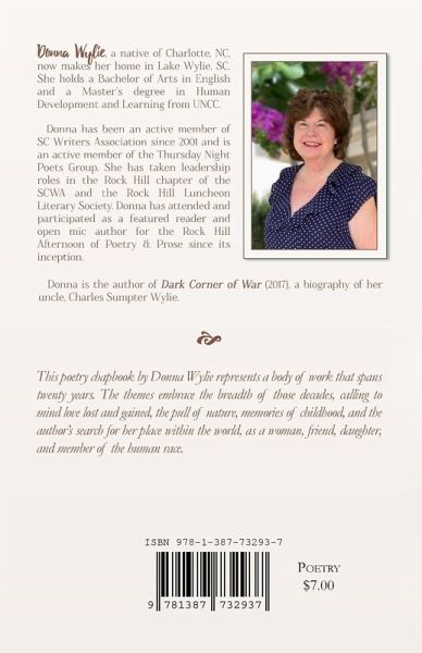 This poetry chapbook by Donna Wylie represents a body of work that spans twenty years. The themes embrace the breadth of those decades, calling to mind love lost and gained, the pull of nature, memories of childhood, and the author's search for her place within the world, as a woman, friend, daughter, and member of the human race. From the Author's Note: "These poems serve as a gateway to the various lives I have lived. From this journey, I have started over several times. Through each transition, my identity has changed and been enriched. I believe as a two-year-old girl, I was my most genuine self-free of filters, norms, and parental expectations. From this early model, I am learning self-acceptance and being truer to myself."