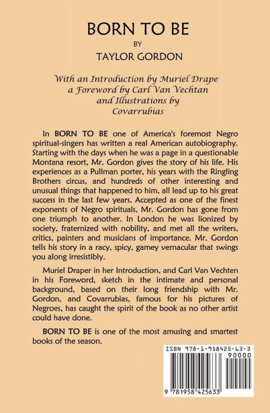 In BORN TO BE one of America's foremost Negro spiritual-singers has written a real American autobiography. Starting with the days when he was a page in a questionable Montana resort, Mr. Gordon gives the story of his life. His experiences as a Pullman porter, his years with the Ringling Brothers circus, and hundreds of other interesting and unusual things that happened to him, all lead up to his great success in the last few years. Accepted as one of the finest exponents of Negro spirituals, Mr. Gordon has gone from one triumph to another. In London he was lionized by society, fraternized with nobility, and met all the writers, critics, painters and musicians of importance. Mr. Gordon tells his story in a racy, spicy, gamey vernacular that swings you along irresistibly. Muriel Draper in her Introduction, and Carl Van Vechten in his Foreword, sketch in the intimate and personal background, based on their long friendship with Mr. Gordon, and Covarrubias, famous for his pictures of Negroes, has caught the spirit of the book as no other artist could have done. BORN TO BE is one of the most amusing and smartest books of the season.