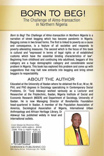 Born to Beg! The Challenge of Alms-transaction in Northern Nigeria By: Dr. ‘Tunji Adewuyi Born to Beg! The Challenge of Alms-transaction in Northern Nigeria is a narration of street begging which has become pandemic in Nigeria. Begging comes in two broad forms. The first is linked to poverty as a cause and consequence, is a feature of all societies and responds to poverty-alleviating measures. The second which is the focus of this book is cultural and "expressed in terms of legal rights or of established customs which have the essential binding characteristics of law". Beginning from childhood and continuing into adulthood, beggars of this category are a huge demographic category and considerable social problem in Nigeria. This book has explored this problem and come up with suggestions that may halt new entrants into begging and bring street beggars to respectability. About the Author Educated at the University of Ibadan where he obtained the B.sc; M.sc; M. Phil; and PhD degrees in Sociology specializing in Contemporary Social Problems, Dr. ‘Tunji Adewuyi worked variously as a Lecturer and Researcher at the Polytechnic, Ibadan, Nigeria Institute of Social and Economic Research (NISER) and Department of Sociology, University of Ibadan. He is now Managing Director of Bonofamilia Foundation head-quartered in Ibadan. A member of the Population Association of America, Sociological Association of Nigeria, International Urban Anthropology and African Heritage Library, Dr Adewuyi has published widely in local and international outlets.