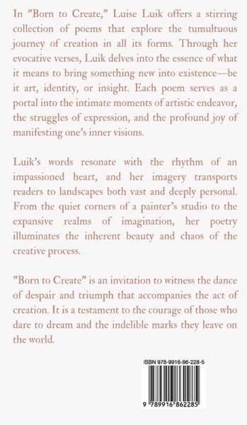 In "Born to Create," Luise Luik offers a stirring collection of poems that explore the tumultuous journey of creation in all its forms. Through her evocative verses, Luik delves into the essence of what it means to bring something new into existence-be it art, identity, or insight. Each poem serves as a portal into the intimate moments of artistic endeavor, the struggles of expression, and the profound joy of manifesting one's inner visions. Luik's words resonate with the rhythm of an impassioned heart, and her imagery transports readers to landscapes both vast and deeply personal. From the quiet corners of a painter's studio to the expansive realms of imagination, her poetry illuminates the inherent beauty and chaos of the creative process. "Born to Create" is an invitation to witness the dance of despair and triumph that accompanies the act of creation. It is a testament to the courage of those who dare to dream and the indelible marks they leave on the world. Copyright (c) 2024 Swan Charm Publishing