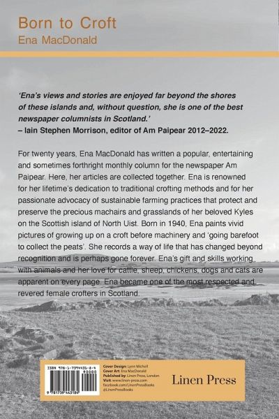 For twenty years, Ena MacDonald has written a popular, entertaining and sometimes forthright monthly column for the newspaper Am Paipear. Here, her articles are collected together. Ena is renowned or her lifetime's dedication to traditional crofting methods and for her passionate advocacy of sustainable farming practices that protect and preserve the precious machairs and grasslands of her beloved Kyles on the Scottish island of North Uist. Born in 1940, Ena paints vivid pictures of growing up on a croft before machinery and 'going barefoot to collect the peats'. She records a way of life that has changed beyond recognition and is perhaps gone forever. Ena's gift and skills working with animals and her love for cattle, sheep, chickens, dogs and cats are apparent on every page. Ena became one of the most respected and revered female crofters in Scotland.