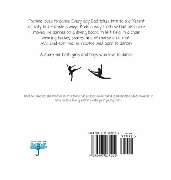 Frankie loves to dance. Every day Dad takes him to a different activity but Frankie always finds a way to show Dad his dance moves. He dances on a diving board, in left field, in a chair, wearing hockey skates, and of course on a mat. Will Dad ever realize Frankie was born to dance? A story for both girls and boys who love to dance. Note to Parents: The mother in this story has passed away but it is never discussed, however, it may raise a few questions with your young child.