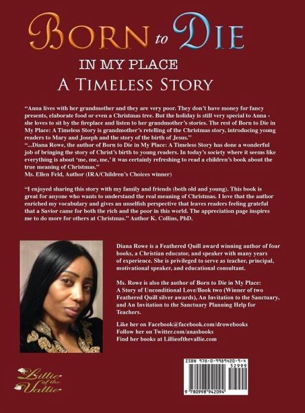 Born to Die in My Place: A Timeless Story by Diana Rowe is a profound and moving retelling of the Christmas story, focused on the true reason for the season- Jesus Christ, born to save humanity. This inspiring book brings to life the miraculous birth of Christ with the underlying message that from the moment He was born, Jesus' purpose was to die for our sins. With heartfelt reflections and biblical insights, this timeless story reminds readers of the incredible love and sacrifice embodied in the birth of Jesus. It invites believers to reflect on the deeper meaning of Christmas-that the manger was just the beginning of Christ's journey to the cross. Through vivid storytelling and scripture, Diana Rowe paints a powerful picture of God's ultimate gift to the world. Whether you're seeking to deepen your understanding of the Christmas story or simply want to reflect on Jesus' mission, Born to Die in My Place: A Timeless Story will renew your faith and appreciation for the true heart of Christmas.Make a great Christmas gift for any age Family Christmas gift Children's Christmas gift Teacher's Christmas gift "...Christmas is about the birth of Christ, and how he was "born to die in my place." Author Diana Rowe has written a lovely book to remind all readers of this fact." Ms. Ellen Feld (IRA/Children's Choices winner) Christian Christmas Books Christian Inspirational Christian Theology Christian Living Christmas Devotionals Biblical Studies Spiritual Growth Christmas story of Jesus Jesus born to die Christian Christmas book meaning of Christmas birth of Jesus Christ God's gift to humanity Jesus' mission for our salvation faith-based Christmas reflections true meaning of Christmas celebrating Jesus at Christmas biblical Christmas story Christmas devotional about Jesus Jesus and the manger salvation through Christ's birth