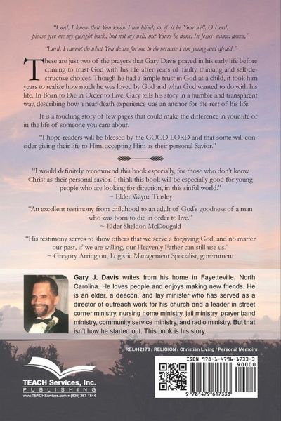 "Lord, I know that You know I am blind; so, if it be Your will, O Lord, please give me my eyesight back, but not my will, but Yours be done. In Jesus' name, amen." "Lord, I cannot do what You desire for me to do because I am young and afraid." These are just two of the prayers that Gary Davis prayed in his early life before coming to trust God with his life after years of faulty thinking and self-destructive choices. Though he had a simple trust in God as a child, it took him years to realize how much he was loved by God and what God wanted to do with his life. In Born to Die in Order to Live, Gary tells his story in a humble and transparent way, describing how a near-death experience was an anchor for the rest of his life. It is a touching story of few pages that could make the difference in your life or in the life of someone you care about. "I hope readers will be blessed by the GOOD LORD and that some will consider giving their life to Him, accepting Him as their personal Savior." "I would definitely recommend this book especially, for those who don't know Christ as their personal savior. I think this book will be especially good for young people who are looking for direction, in this sinful world." ~ Elder Wayne Tinsley "An excellent testimony from childhood to an adult of God's goodness of a man who was born to die in order to live." ~ Elder Sheldon McDougald "His testimony serves to show others that we serve a forgiving God, and no matter our past, if we are willing, our Heavenly Father can still use us." ~ Gregory Arrington, Logistic Management Specialist, government