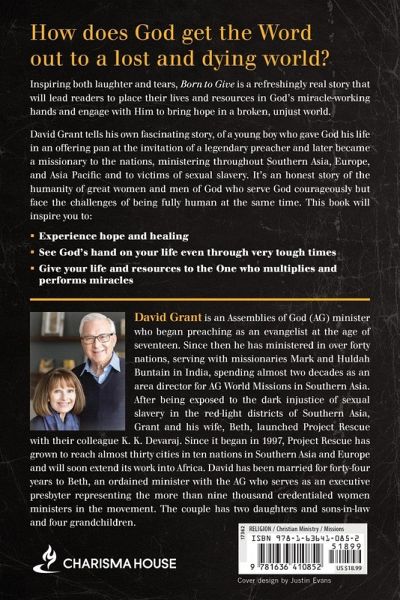 How does God get the Word out to a lost and dying world? This book will inspire you to see yourself as a tool for God's kingdom. God has a ministry for everyone, and He will use what you make available to Him. Missionary-preacher David Grant's name has become synonymous in the Assemblies of God with riveting storytelling that makes listeners laugh one minute and cry the next. Very human stories of a kid growing up in Southern parsonages mix with deeply moving stories that expose great human need around the world and the great heart of our compassionate God who cares for the neediest and exploited. In Born to Give, Grant tells his own riveting story, of a young boy who gave God his life in an offering pan at the invitation of a legendary missionary and became a missionary to the nations, ministering throughout Southern Asia, Europe, and Asia Pacific, and to victims of sexual slavery. Inspiring both laughter and tears, Born to Give is a refreshing and real story that will lead readers to place their own lives and resources in God's miracle-working hands and engage with Him to bring hope in a broken, unjust world.