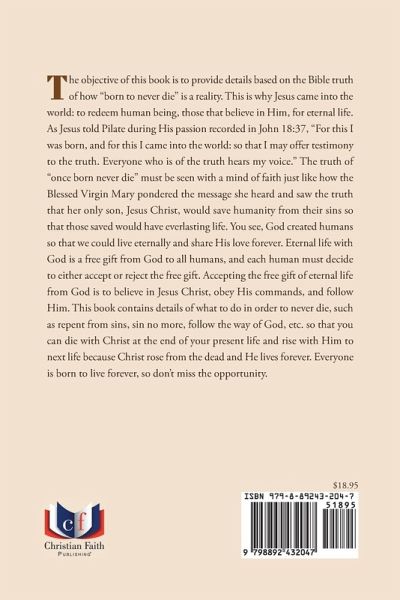 The objective of this book is to provide details based on the Bible truth of how "born to never die" is a reality. This is why Jesus came into the world: to redeem human being, those that believe in Him, for eternal life. As Jesus told Pilate during His passion recorded in John 18:37, "For this I was born, and for this I came into the world: so that I may offer testimony to the truth. Everyone who is of the truth hears my voice." The truth of "once born never die" must be seen with a mind of faith just like how the Blessed Virgin Mary pondered the message she heard and saw the truth that her only son, Jesus Christ, would save humanity from their sins so that those saved would have everlasting life. You see, God created humans so that we could live eternally and share His love forever. Eternal life with God is a free gift from God to all humans, and each human must decide to either accept or reject the free gift. Accepting the free gift of eternal life from God is to believe in Jesus Christ, obey His commands, and follow Him. This book contains details of what to do in order to never die, such as repent from sins, sin no more, follow the way of God, etc. so that you can die with Christ at the end of your present life and rise with Him to next life because Christ rose from the dead and He lives forever. Everyone is born to live forever, so don't miss the opportunity.
