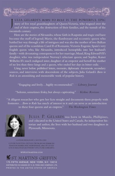 Julia Gelardi's Born to Rule is the powerful epic story of five royal granddaughters of Queen Victoria, who reigned over the end of their empires, the destruction of their families, and the tumult of the twentieth century Here are the stories of Alexandra, whose faith in Rasputin and tragic end have become the stuff of legend; Marie, the flamboyant and eccentric queen who battled her way through a life of intrigues and was also the mother of two Balkan queens and of the scandalous Carol II of Romania; Victoria Eugenie, Spain's very English queen who, like Alexandra, introduced hemophilia into her husband's family---with devastating consequences for her marriage; Maud, King Edward VII's daughter, who was independent Norway's reluctant queen; and Sophie, Kaiser Wilhelm II's much maligned sister, daughter of an emperor and herself the mother of no less than three kings and a queen, who ended her days in bitter exile. Using never before published letters, memoirs, diplomatic documents, secondary sources, and interviews with descendents of the subjects, Julia Gelardi's Born to Rule is an astonishing and memorable work of popular history.