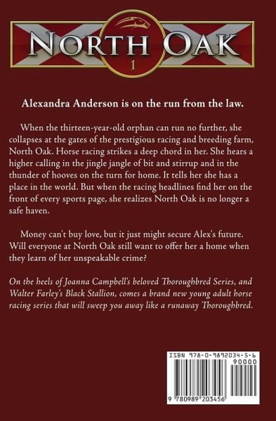 Alexandra Anderson is on the run from the law. When the thirteen-year-old orphan can run no further, she collapses at the gates of the prestigious racing and breeding farm, North Oak. Horse racing strikes a deep chord in her. She hears a higher calling in the jingle jangle of bit and stirrup and in the thunder of hooves on the turn for home. It tells her she has a place in the world. But when the racing headlines find her on the front of every sports page, she realizes North Oak is no longer a safe haven. Money can't buy love, but it just might secure Alex's future. Will everyone at North Oak still want to offer her a home when they learn of her unspeakable crime? On the heels of Joanna Campbell's beloved Thoroughbred Series, and Walter Farley's Black Stallion, comes a brand new teen equestrian series that will sweep you away like a runaway Thoroughbred.