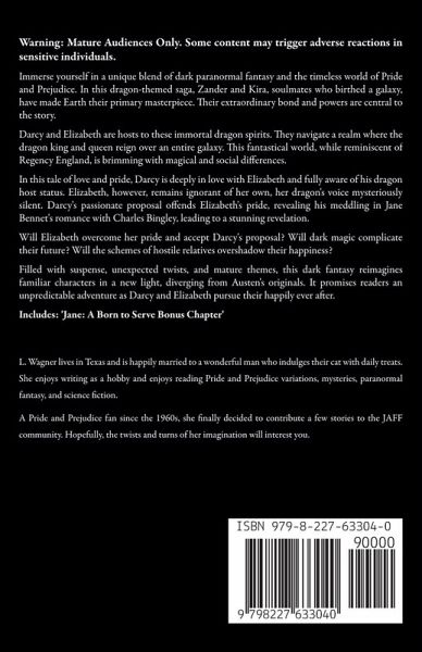 Warning: Mature Audiences Only. Some content may trigger adverse reactions in sensitive individuals. Immerse yourself in a unique blend of dark paranormal fantasy and the timeless world of Pride and Prejudice. In this dragon-themed saga, Zander and Kira, soulmates who birthed a galaxy, have made Earth their primary masterpiece. Their extraordinary bond and powers are central to the story. Darcy and Elizabeth are hosts to these immortal dragon spirits. They navigate a realm where the dragon king and queen reign over an entire galaxy. This fantastical world, while reminiscent of Regency England, is brimming with magical and social differences. In this tale of love and pride, Darcy is deeply in love with Elizabeth and fully aware of his dragon host status. Elizabeth, however, remains ignorant of her own, her dragon's voice mysteriously silent. Darcy's passionate proposal offends Elizabeth's pride, revealing his meddling in Jane Bennet's romance with Charles Bingley, leading to a stunning revelation. Will Elizabeth overcome her pride and accept Darcy's proposal? Will dark magic complicate their future? Will the schemes of hostile relatives overshadow their happiness? Filled with suspense, unexpected twists, and mature themes, this dark fantasy reimagines familiar characters in a new light, diverging from Austen's originals. It promises readers an unpredictable adventure as Darcy and Elizabeth pursue their happily ever after. Approximately 121,000 words