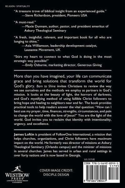 More than you have imagined, your life can communicate grace and bring solutions that transform the world for God's glory. Born to Shine invites Christians to review the way we see ourselves and the methods we employ as partners in God's mission. It looks at the beauty of light, the horrors of darkness, and God's mystifying method of using fallible Christ followers to bring hope and healing to neighbors near and far. The book provides practical tools to help readers answer the vital question: "How can I best use my prayer, time, finances, strengths, circumstances, and pain to change the world with the love of Jesus?" You are the light of the world. God invites you to reclaim that identity with intentionality, urgency, and excellence.