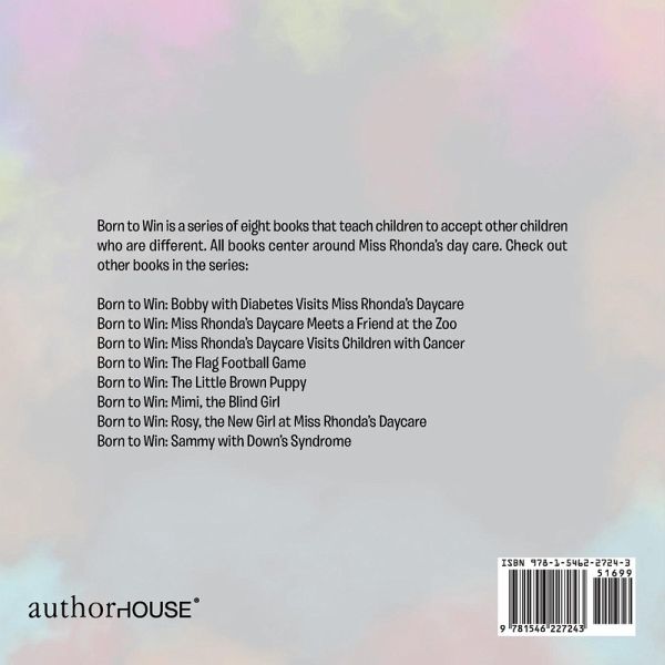 Born to Win is a series of eight books that teach children to accept other children who are different. All books center around Miss Rhondas day care. Check out other books in the series: Born to Win: Bobby with Diabetes Visits Miss Rhondas Daycare Born to Win: Miss Rhondas Daycare Meets a Friend at the Zoo Born to Win: Miss Rhondas Daycare Visits Children with Cancer Born to Win: The Flag Football Game Born to Win: The Little Brown Puppy Born to Win: Mimi, the Blind Girl Born to Win: Rosy, the New Girl at Miss Rhondas Daycare Born to Win: Sammy with Downs Syndrome