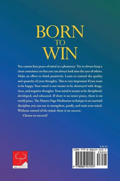 Born to Win You cannot buy peace of mind at a pharmacy. Try to always keep a clean conscience so that you can always look into the eyes of others. Make an effort to think positively. Learn to control the quality and quantity of your thoughts. This is very important if you want to be happy. Your mind is not meant to be destroyed with drugs, vices, and negative thoughts. Your mind is meant to be disciplined, developed, and educated. If there is no inner peace, there is no world peace. The Mantra Yoga Meditation technique is an essential discipline you can use to strengthen, purify, and train your mind. Without control of the mind, there is no success. Choose to succeed!