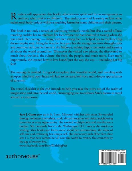 Readers will appreciate this book's adventurous spirit and its encouragement to embrace what makes us different. The undercurrent of learning to love what makes one's body unique will be a touching lesson for many children and their parents. This book is not only a record of one young woman's travels, but also a record of how traveling enables her to celebrate her feet, whose size had resulted in teasing when she was a kid. Her courage - along with her strong feet - helped her to reach her big dream step by step. Along the way, her feet gave her the strength to move through cities and countries far from her home in the Midwest, making happy memories and learning all about the world around her. Whenever she visited new places, she discovered so much about the land, the culture, the food, the people, and much more. Even more importantly, she learned how to love herself just the way she was - including her big feet! The message is twofold: it is good to explore this beautiful world, and traveling with an open mind and open heart will lead to increased self-love and a deeper appreciation of diversity. The travel checklist at the end intends to help you take the story out of the realm of imagination and into the real world, encouraging you to embrace Sara's dream to travel abroad, as your own.