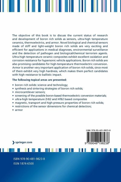 The objective of this book is to discuss the current status of research and development of boron-rich solids as sensors, ultra-high temperature ceramics, thermoelectrics, and armor. Novel biological and chemical sensors made of stiff and light-weight boron-rich solids are very exciting and efficient for applications in medical diagnoses, environmental surveillance and the detection of pathogen and biological/chemical terrorism agents. Ultra-high temperature ceramic composites exhibit excellent oxidation and corrosion resistance for hypersonic vehicle applications. Boron-rich solids are also promising candidates for high-temperature thermoelectric conversion. Armor is another very important application of boron-rich solids, since most of them exhibit very high hardness, which makes them perfect candidates with high resistance to ballistic impact.The following topical areas are presented:-Boron-rich solids: science and technology-Synthesis and sintering strategies of boron rich solids-Microcantilever sensors-Screening of the possible boron-based thermoelectric conversion materials;-Ultra-high temperature ZrB2 and HfB2 based composites-Magnetic, transport and high-pressure properties of boron-rich solids-Restrictions of the sensor dimensions for chemical detection-Armor