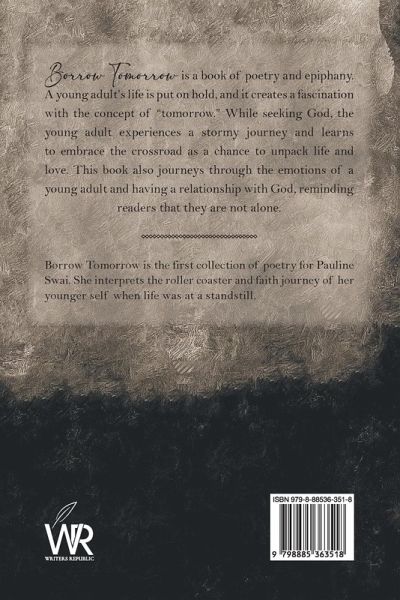 Borrow Tomorrow is a book of poetry and epiphany. A young adult's life is put on hold, and it creates a fascination with the concept of "tomorrow." While seeking God, the young adult experiences a stormy journey and learns to embrace the crossroad as a chance to unpack life and love. This book also journeys through the emotions of a young adult and having a relationship with God, reminding readers that they are not alone.