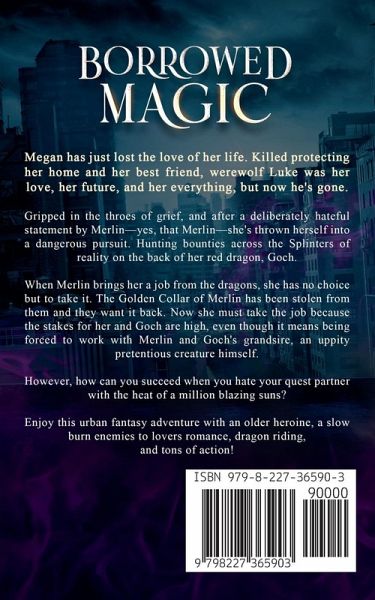 Megan has just lost the love of her life. Killed protecting her home and her best friend, werewolf Luke was her love, her future, and her everything, but now he's gone. Gripped in the throes of grief, and after a deliberately hateful statement by Merlin-yes, that Merlin-she's thrown herself into a dangerous pursuit. Hunting bounties across the Splinters of reality on the back of her red dragon, Goch. When Merlin brings her a job from the dragons, she has no choice but to take it. The Golden Collar of Merlin has been stolen from them and they want it back. Now she must take the job because the stakes for her and Goch are high, even though it means being forced to work with Merlin and Goch's grandsire, an uppity pretentious creature himself. However, how can you succeed when you hate your quest partner with the heat of a million blazing suns? Enjoy this urban fantasy adventure with an older heroine, a slow burn enemies to lovers romance, dragon riding, and tons of action!