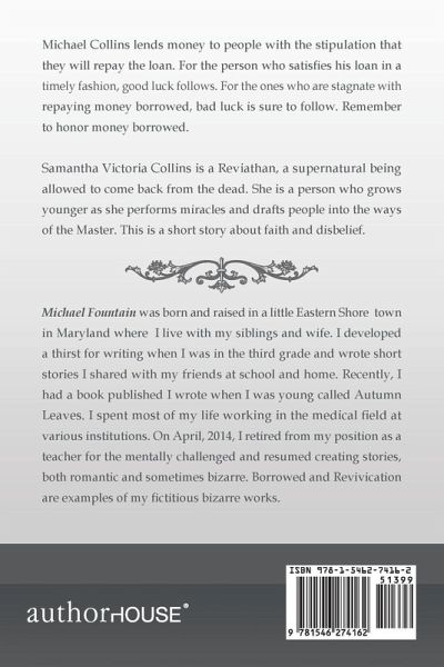 Michael Collins lends money to people with the stipulation that they will repay the loan. For the person who satisfies his loan in a timely fashion, good luck follows. For the ones who are stagnate with repaying money borrowed, bad luck is sure to follow. Remember to honor money borrowed. Samantha Victoria Collins is a Reviathan, a supernatural being allowed to come back from the dead. She is a person who grows younger as she performs miracles and drafts people into the ways of the Master. This is a short story about faith and disbelief.