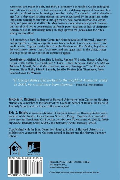 " A Brookings Institution Press and Harvard University Joint Center for Housing Studies publication Americans are awash in debt, and the U.S. economy is in trouble. Credit undergirds daily life more than everit has become one of the defining aspects of American life, and the ramifications are becoming clearer by the day. The already considerable damage from a depressed housing market has been exacerbated by the subprime lender implosion, sending shock waves through the financial sector, international economies, and government at all levels. Most low- or moderate-income people borrow, but that should not be construed as uniformly poor judgment or lack of disciplinesAmericans are not borrowing merely to keep up with the Joneses, but too often simply to stay afloat. In Borrowing to Live, the Joint Center for Housing Studies of Harvard University brings together a group of experts drawn from the best of academia, research, and public services. Together with editors Nicolas Retsinas and Eric Belsky, they dissect the worrisome current state of consumer and mortgage credit in the United States and help point the way out of the current struggles. Contributors: Michael S. Barr, Eric S. Belsky, Raphael W. Bostic, Shawn Cole, Amy Crews Cutts, Kathleen C. Engel, Ren S. Essene, Elaine Kempson, Patricia A. McCoy, William A. Merrill, Sendhil Mullainathan, Anthony Pennington-Cross, Elizabeth Renuart, Eldar Shafir, Edna R. Sawady, Jennifer Tescher, John Thompson, Peter Tufano, Susan M. Wachter "