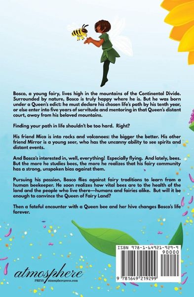 Bosco, a young fairy, lives high in the mountains of the Continental Divide. Surrounded by nature, Bosco is truly happy where he is. But he was born under a Queen's edict: he must declare his chosen life's path by his tenth year, or else enter into five years of servitude and mentoring in that Queen's distant court, away from his beloved mountains. Finding your path in life shouldn't be too hard. Right? His friend Mica is into rocks and volcanoes: the bigger the better. His other friend Mirror is a young seer, who has the uncanny ability to see spirits and distant events. And Bosco's interested in, well, everything! Especially flying. And lately, bees. But the more he studies bees, the more he realizes that his fairy community has a strong, unspoken bias against them. Pursuing his passion, Bosco flies against fairy traditions to learn from a human beekeeper. He soon realizes how vital bees are to the health of the land and the people who live there-humans and fairies alike. But will it be enough to convince the Queen of Fairy Land? Then a fateful encounter with a Queen bee and her hive changes Bosco's life forever.