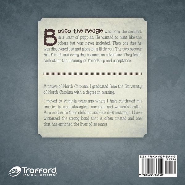 Bosco the Beagle was born the smallest in a litter of puppies. He wanted to hunt like the others but was never included. Then one day he was discovered sad and alone by a little boy. The two become fast friends and every day becomes an adventure. They teach each other the meaning of friendship and acceptance.