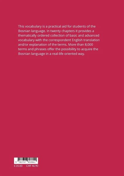 This vocabulary is a practical aid for students of the Bosnian language. In twenty chapters it provides a thematically ordered collection of basic and advanced vocabulary with the correspondent English translation and/or explanation of the terms. More than 8,000 terms and phrases offer the possibility to acquire the Bosnian language in a real-life oriented way.