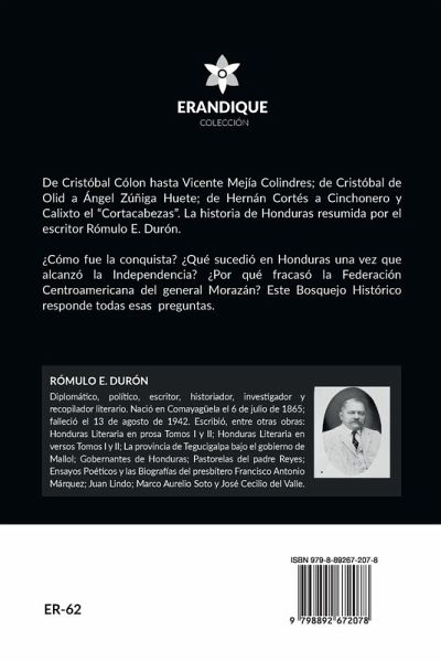 De Cristóbal Cólon hasta Vicente Mejía Colindres; de Cristóbal de Olid a Ángel Zúñiga Huete; de Hernán Cortés a Cinchonero y Calixto el "Cortacabezas". La historia de Honduras resumida por el escritor Rómulo E. Durón. ¿Cómo fue la conquista? ¿Qué sucedió en Honduras una vez que alcanzó la Independencia? ¿Por qué fracasó la Federación Centroamericana del general Morazán? Este Bosquejo Histórico responde todas esas preguntas.