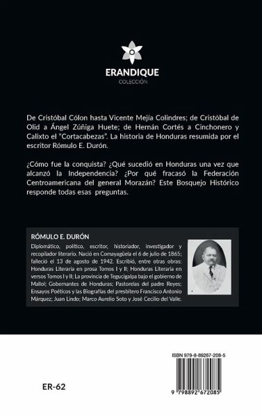 De Cristóbal Cólon hasta Vicente Mejía Colindres; de Cristóbal de Olid a Ángel Zúñiga Huete; de Hernán Cortés a Cinchonero y Calixto el "Cortacabezas". La historia de Honduras resumida por el escritor Rómulo E. Durón. ¿Cómo fue la conquista? ¿Qué sucedió en Honduras una vez que alcanzó la Independencia? ¿Por qué fracasó la Federación Centroamericana del general Morazán? Este Bosquejo Histórico responde todas esas preguntas.