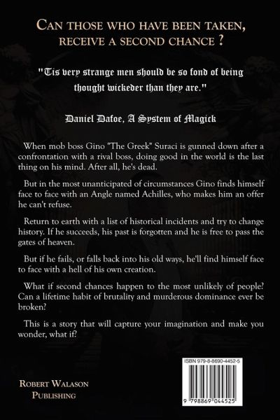 CAN THOSE WHO HAVE BEEN TAKEN, RECEIVE A SECOND CHANCE ? When mob boss Gino Suraci is gunned down after a confrontation with a rival boss doing good in the world is the last thing on his mind. After all , he's dead. But in the most unanticipated of circumstances Geno finds himself face to face with an Angel named Achilles, who makes him an offer he can't refuse. Return to earth with a list of historical incidents and try to change history. If he succeeds, his past is forgotten and he is free to pass the gates of heaven though if he fails all falls back into his old ways, he'll find himself face to face with a hell of his own creation. What if second chances happen to the most unlikely of people? Can a lifetime habit of brutality and murderous dominance ever be broken? This is a story that will capture your imagination and make you wonder, WHAT IF ?