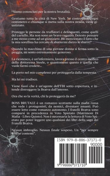 Siamo conosciuti per la nostra brutalità. Gestiamo tutta la città di New York. Ne controlliamo ogni centimetro e chiunque si metta sulla nostra strada, viene giustiziato. Proteggo le persone da truffatori e delinquenti, come quelli del cartello. Ma non sono un bravo ragazzo. Detesto pensare a me stesso come ad un giustiziere. Ho menzionato il fatto che la mia sorellina ha cercato di sbattermi dietro le sbarre? Quando la macchina di una giovane donna si ferma sotto la pioggia, mi sento estremamente generoso. La riconosco, è un'infermiera, lavora presso il centro medico della dottoressa Steele, o quantomeno questo è quello che vuole farmi credere… La porto nel mio complesso per proteggerla dalla tempesta. Ma lei mi tradisce. Viene fuori che è un'agente dell'FBI sotto copertura, e intende distruggere la Bratva dall'interno. Ora che so la verità, chi la proteggerà da me? BOSS BRUTALE è un romanzo scottante sulla mafia russa che vede i protagonisti, da nemici, diventare amanti. Può essere letto come romanzo autonomo. I fratelli Bratva sono comparsi in precedenza in Voto Spietato (Matrimoni Di Mafia - Libro Quinto). Non è necessaria la lettura di Voto Spietato per poter leggere uno qualsiasi dei libri della saga dei Fratelli Bratva. Nessun imbroglio. Nessun finale sospeso. Un "per sempre felici e contenti.