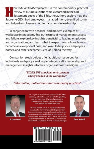 How did God treat employees? In this contemporary, practical review of business relationships recorded in the Old Testament books of the Bible, the authors explore how the Supreme CEO hired employees, managed them, even fired some, and helped employees execute transitions in leadership. In conjunction with historical and modern examples of workplace interactions, find out secrets of management success and failure, explore key insights beneficial to leading employees and organizations, and learn what to expect from a boss, how to become an exceptional boss, and ways to help your employees, bosses, and others become successful along the way. Companion study guides offer additional resources for individuals and groups seeking to integrate elite leadership and management insights into their organizational paradigms.