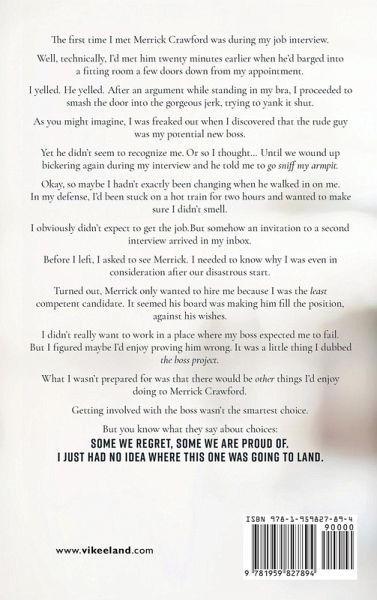 A new, sexy standalone from #1 New York Times Bestseller, Vi Keeland. The first time I met Merrick Crawford was during my job interview. Well, technically, I'd met him twenty minutes earlier when he'd barged into a fitting room a few doors down from my appointment. I yelled. He yelled. After an argument while standing in my bra, I proceeded to smash the door into the gorgeous jerk, trying to yank it shut. As you might imagine, I was freaked out when I discovered that the rude guy was my potential new boss. Yet he didn't seem to recognize me. Or so I thought... Until we wound up bickering again during my interview and he told me to go sniff my armpit. Okay, so maybe I hadn't exactly been changing when he walked in on me. In my defense, I'd been stuck on a hot train for two hours and wanted to make sure I didn't smell. I obviously didn't expect to get the job. But somehow an invitation to a second interview arrived in my inbox. Before I left, I asked to see Merrick. I needed to know why I was even in consideration after our disastrous start. Turned out, Merrick only wanted to hire me because I was the least competent candidate. It seemed his board was making him fill the position, against his wishes. I didn't really want to work in a place where my boss expected me to fail. But I figured maybe I'd enjoy proving him wrong. It was a little thing I dubbed the boss project. What I wasn't prepared for was that there would be other things I'd enjoy doing to Merrick Crawford. Getting involved with the boss wasn't the smartest choice. But you know what they say about choices: Some we regret, some we are proud of. I just had no idea where this one was going to land.