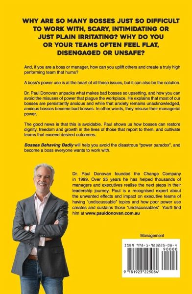WHY ARE SO MANY BOSSES JUST SO DIFFICULT TO WORK WITH, SCARY, INTIMIDATING OR JUST PLAIN IRRITATING? WHY DO YOU OR YOUR TEAMS OFTEN FEEL FLAT, DISENGAGED OR UNSAFE? And, if you are a boss or manager, how can you uplift others and create a truly high performing team that hums? A boss's power use is at the heart of all these issues, but it can also be the solution. Dr. Paul Donovan unpacks what makes bad bosses so upsetting, and how you can avoid the misuses of power that plague the workplace. He explains that most of our bosses are persistently anxious and while that anxiety remains unacknowledged, anxious bosses become bad bosses. In other words, they misuse their managerial power. The good news is that this is avoidable. Paul shows us how bosses can restore dignity, freedom and growth in the lives of those that report to them, and cultivate teams that exceed desired outcomes. Bosses Behaving Badly will help you avoid the disastrous "power paradox", and become a boss everyone wants to work with.