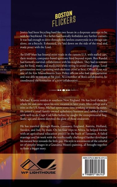 Jessica had been bicycling hard for two hours in a desperate attempt to be with her boyfriend. Her father had basically forbidden any further contact. It was bad enough to drive through this lawless countryside in a vintage car; alone, on a bicycle. Exhausted, she laid down on the side of the road and made peace with the Lord. An EMP blast has littered most roads in the eastern U.S. with stalled cars, their modern, computer-based ignitions fried beyond repair. Ben Randal had formed a survival collaboration with his neighbors. They had to venture out for food, water, and medicines while trying to avoid local gangs. Local governments were operating with skeleton crews at best. Officer Ryan was one of the few Massachusetts State Police officers who had transportation and was able to remain at his post. As a member of Ben's collaborative, he coordinated the formation of a new collaborative.
