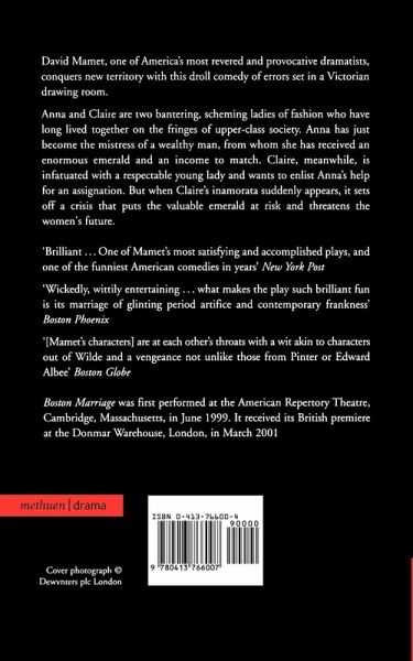 One of America's most revered and provocative dramatists, David Mamet conquers new territory with this droll comedy of errors set in a Victorian drawing room. Anna and Claire are two bantering, scheming ladies of fashion who have long lived together on the fringes of upper-class society. Anna has just become the mistress of a wealthy man, from whom she has received an enormous emerald and an income to match. Claire, meanwhile, is infatuated with a respectable young lady and wants to enlist the jealous Anna's help for an assignation. As the two women exchange barbs and take turns taunting Anna's hapless parlour maid, Claire's young inamorata suddenly appears, setting off a crisis that puts the valuable emerald at risk and threatens the women's future. "Devastatingly funny . . . exceptionally clever" - New York Times "Brilliant . . . One of Mamet's most satisfying and accomplished plays, and one of the funniest American comedies in years" - New York Post "Wickedly, wittily entertaining . . . what makes the play such brilliant fun is its marriage of glinting period artifice and contemporary frankness" - Boston Phoenix "[Mamet's characters] are at each other's throats with a wit akin to characters out of Wilde and a vengeance not unlike those from Pinter or Edward Albee" - Boston Globe Boston Marriage was first performed at the American Repertory Theatre, Cambridge, Massachusetts, in June 1999. It received its British premiere at the Donmar Warehouse, London, in March 2001.